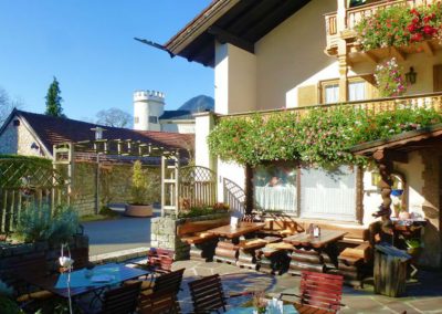 In unserem Biergarten im Schlossberghof Bad Reichenhall, erwartet Sie gepflegte Gastlichkeit mit bayerischer Gemütlichkeit. Wir servieren Ihnen bayerische Brotzeiten und fangfrische Fische aus unserem Fischbecken.